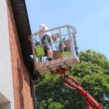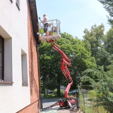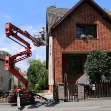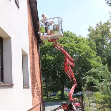 Vlastníme i výškový žebřík, podle obtížnosti dispozic máme i kloubový výškový žebřík. Při nátěrěch fasád spolupracujeme s odborníky, kteří mají dlouholeté zkušenosti s nátěry fasád i s různými problémy, které nastávají na fasádách. Máme na mysli různé znečištění, neustále objevující se mechy i řasy. Spolupracujeme s odborníky i v rámci prodeje fasádních barev, tak i prostředků na aplikaci fasádních barev. Pro všechny zákazníky, kteří chtějí mít nový kabát fasády, nabízíme 3 druhy fasádních barev. Jedná se o akrylátovou fasádní barvu, silikonovou i silikátovou fasádní barvu.